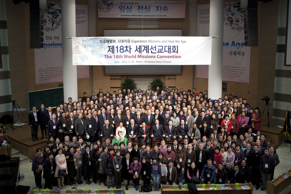 * 일시 : 2014.2.20(목) * 장소 : 임마누엘서울교회 * 내용 : 49개국에서 온 선교사들과 4000여명의 성도들이 참여한 가운데 제18차 세계선교대회가 2월 17일부터 19일까지의 선교사합숙훈련과 20 일의 세계선교대회가 각각 RUTC와 임마누엘서울교회에서 성대하게 진행되었다. * 선교사 합숙 훈련[ 1강 : 일심 - 기도(오직)(행1:1-8) 2강 : 전심 - 올인(전도, 선교)(벧전2:9), 3강 : 지속 -서밋(올인)(행2:1)] 세계선교대회 [ 1강 : 복음선교체험과 시대 치유(행8:1-3, 4-8) 2강 : 하나님 시간표 속으로(행8:38-40)]