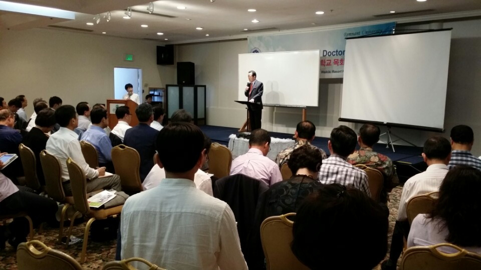 * 일시 : 2014.10.14(화)~15(수) * 장소 : 하와이 * 내용 : 렘넌트 대학 RU가 하와이 캠퍼스로 이전하면서 실제로 전도하는 차세대 전도지도자를 양성하는 훈련센터로 거듭나고 있습니다. 캠퍼스를 이전해 지난 8월 25일 첫 수업을 시작한 RU는 다락방 전도운동의 증거가 있는 한국 교회의 목회자를 초청해서 강의하고 있습니다. 특히 다락방부터 지교회까지 전도운동의 증거를 가진 목회자를 양성키 위해 두란노 프로그램을 진행, 현재 선별된 제자 3명이 훈련받으며 전도자로 키워지고 있습니다. 지난 15일엔 호놀룰루에 위치한 토파 파이낸셜 빌딩 20층 강의실에서 이전 감사예배를 드렸습니다. 테입커팅으로 시작한 이번 감사예배는 총장 정은주 목사의 사회로, 재정후원이사장 김동권 목사의 기도, 총회 부총회장 김운복 목사의 성경봉독 등 한국과 미국 목회자들과 중직자, 재학생들이 참석한 가운데 열렸습니다. 류광수 목사는 RU에서 차세대 전도 지도자를 양성하라는 미션을 전달했습니다. 또, 15일부터 1박2일간 목회학 박사과정이 열려 3강의 말씀이 선포됐고, 하와이 한인방송 KBFD에서 RU에 대해 취재하기도 했습니다. 16일 아침엔 이사회를 열고 마라나타 교회 박봉룡 장로를 새로운 RU 이사로 임명했습니다. 이어 한국 내 RU후원회를 관리, 소통하는 일에 류치영 목사를 담당으로 세웠고, 매달 소식지를 발간해 RU의 응답을 전세계에 전달키로 했습니다. 또 전도에 중심있는 목회자와 중직자를 대상으로한 명예박사 학위수여를 검토하기로 하고, 최영수 목사를 추진위원장으로 세웠습니다. RU는 현재 10명의 재정후원 상임이사, 5명의 준 상임이사, 18명의 이사가 매달 후원을 지속해, 올 한해 총 1억 6천여 만원을 후원했고, 특히 구 하와이 참빛교회인 마라나타 선교교회에서 장영학 목사와 중직자들이 매달 700만원씩 올 한해만 총 3,700여만원을 후원했습니다. 또 초대교회 조헌수 목사가 300여만원을 장학금으로 헌금해 처음으로 두명의 학생에게 장학금을 지급하기도 했습니다.