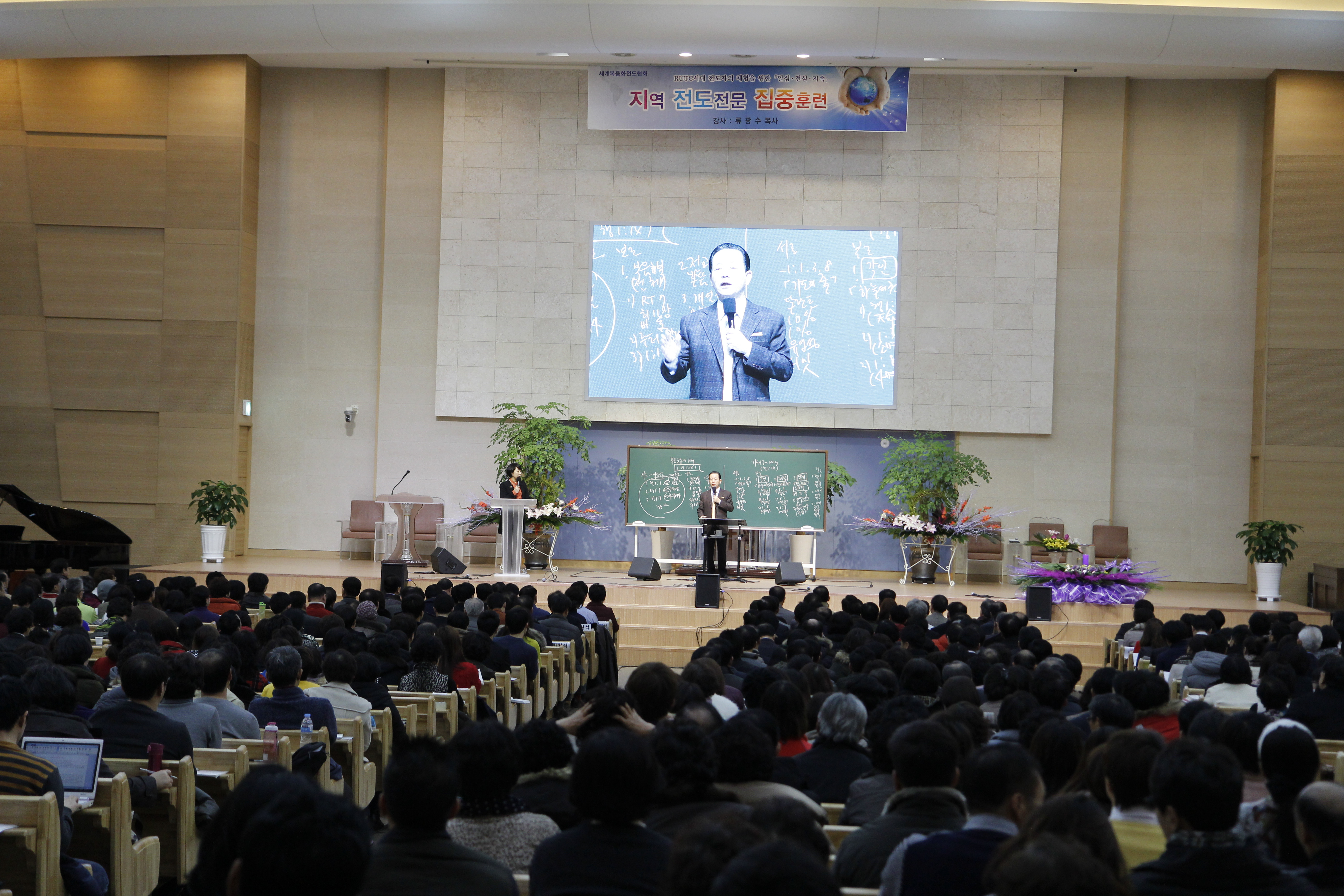 * 일시 : 2014.12.2(화) * 장소 : 임마누엘경인교회 * 내용 : 부천, 인천지역 집중전도훈련이 지난 2일 인천의 임마누엘경인교회에서 지역과 국내외 사명자 1200여명이 참석한 가운데 열렸습니다. 세계복음화 전도협회 이사장 류광수 목사는 전도집중시대에 반드시 응답받을 복음운동의 키는 바로 “말씀운동”이라고 말하며 예수 그리스도, 하나님의 나라, 성령의 능력 등 말씀의 핵심인 복음을 회복하는 말씀운동을 일으키라고 강조했습니다. 이어, 기도운동의 키로 하늘과 땅, 모든 권세를 누리는 나만의 기도의 줄을 제시했고, 전도운동의 키는 교회를 살리고 렘넌트를 살리는 등 모든 사람을 살리는 것이라고 전했습니다. 이에 앞서 10월 24일부터 한달간 열린 개교회 맞춤 집중훈련을 통해, 부천과 인천지역에 현장지교회 7곳, 복지지교회 1곳, 전문인지교회 2곳, 대학지교회 1곳 등 총 11개 예비지교회를 세웠습니다. 올 한 해 서울 강서지역을 시작으로 7지역을 순회하며 지역집중캠프가 열렸고, 전국에 총 324개 예비지교회와 8개 본부 확정지교회가 설립됐습니다. 전도전문훈련원은 이같은 예비지교회 담당자 집중훈련을 12일부터 1박2일간, 확정지교회 중직자와 사역자 집중훈련을 25일부터 2박3일간 덕평 RUTC에서 엽니다. 류광수 목사의 특강과, 전도전문훈련원 진행자, 간증자들의 강의, 현장사역을 포럼하는 시간을 갖습니다.