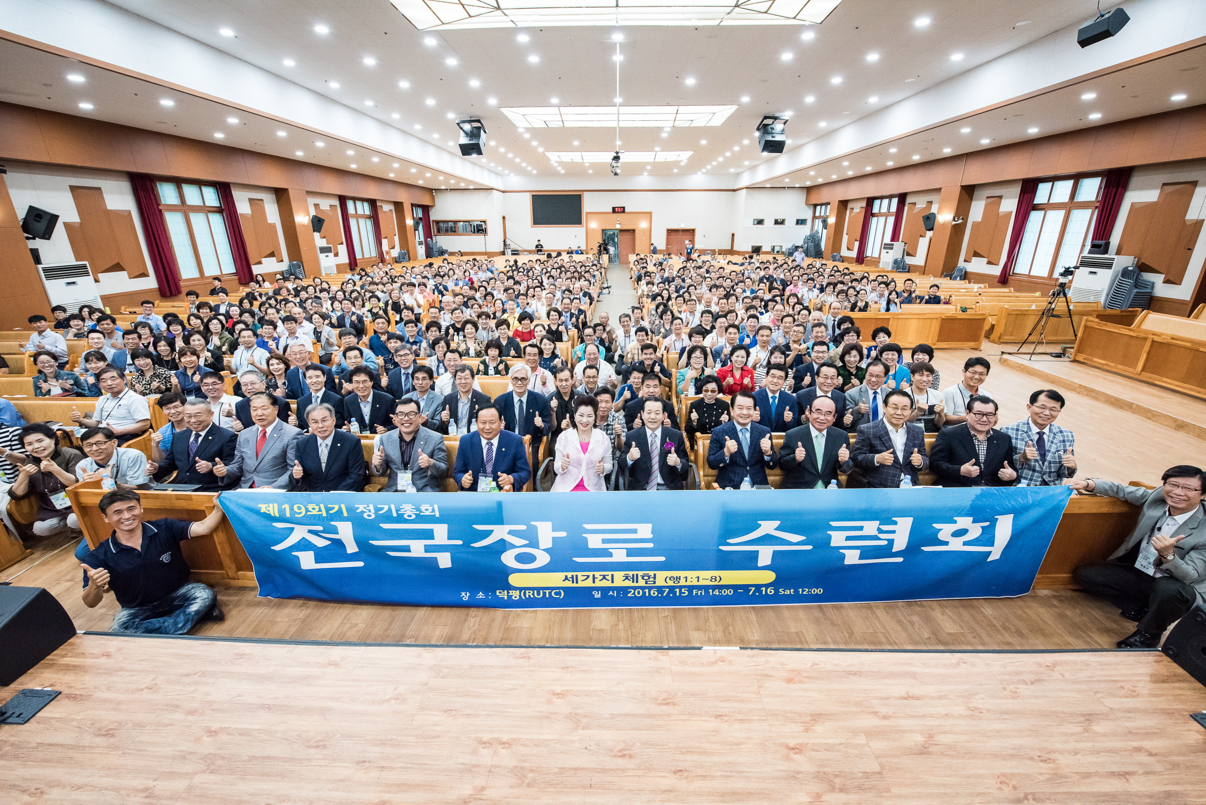* 일시 : 2016.7.15(금)~16(토) * 장소 : 덕평 RUTC * 내용 : 전국장로수련회가 500여명의 장로들이 참석한 가운데 "세 가지 체험"이라는 주제로 덕평RUTC에서 1박2일의 일정으로 진행되었다. 총회장 김운복 목사가 개회예배 메시지를 전달하였고, 강사로 나온 류광수 목사는 3강의 메시지를 통해 장로들이 꼭 실천해야 할 미션을 전달하였다. 1강 후 열린 제19회 장로회 총회에서는 회장에 서동신 장로, 부회장에 최원택 장로, 총무에 서문성태 장로 등 새로운 임원들이 선출되었다. [ 1강 : 세 가지 방향 - 비밀"장로의 영적 축복과 정체성의 비밀(고전 4:1-2), 2강 : 장로 조직 전문화(행 11:19), 3강 : 21세기 장로의 사명(행 27:24)]