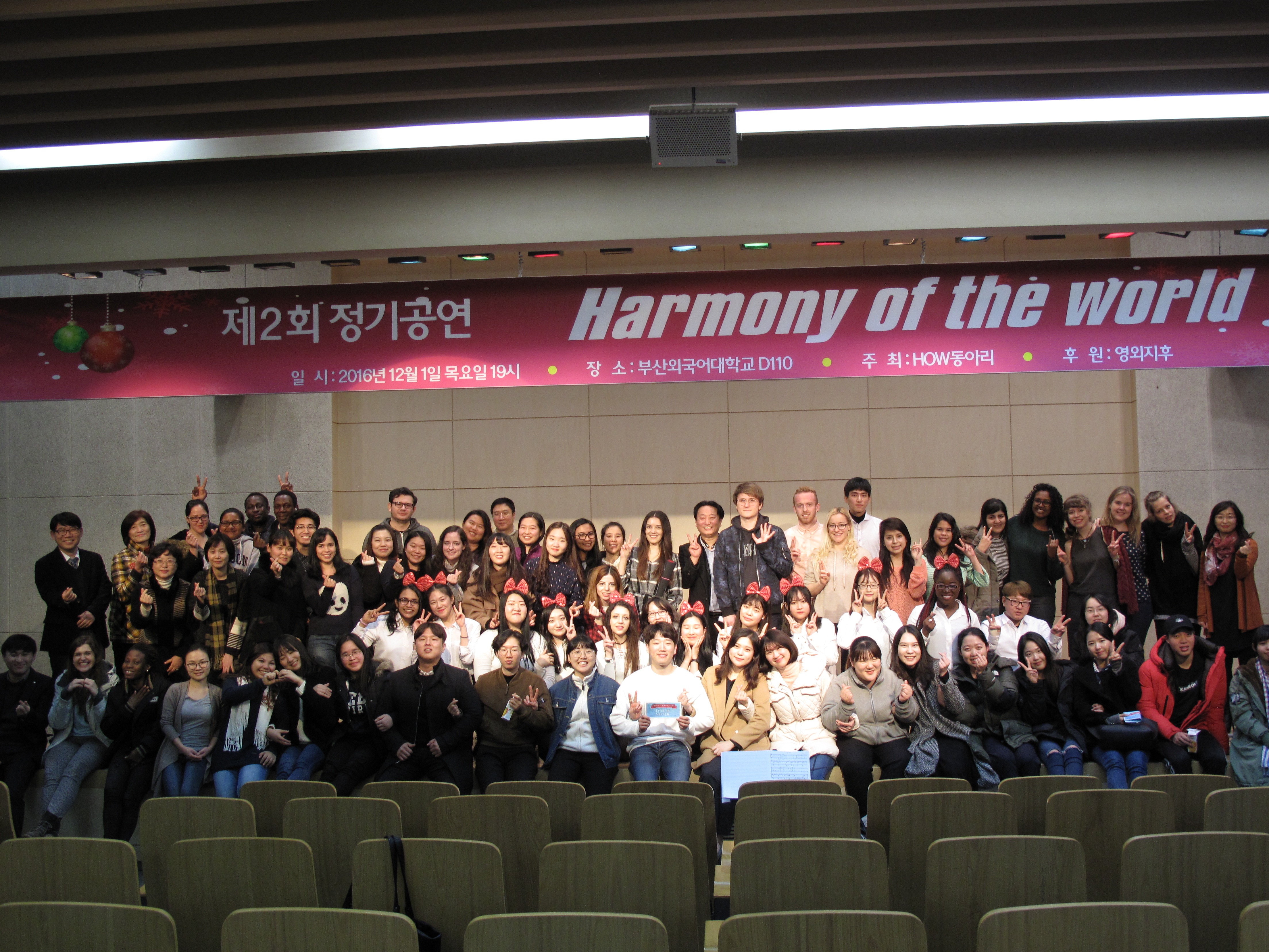 * 일시 : 2016.12.1(목) 19:00 * 장소 : 부산외국어대학교 * 내용 : 매년 성탄절을 앞두고 공연하는 Harmony of the World 정기공연이 부산외국어대학교에서 많은 외국인 유학생들이 참여한 가운데 성대히 진행되었다.
