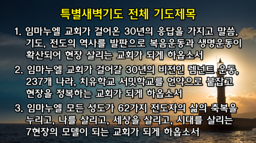 * 일시 : 2017.8.28(월)~9.15(금) * 장소 : 임마누엘교회 * 내용 : 교회 설립 30주년을 맞이하여 앞으로의 30년을 준비하는 전 교인 집중새벽기도가 3주간의 모든 일정을 마쳤다. 최종일인 9월 15일에는 전 교인이 영도 본 교회당에 모여서 합심하여 기도하는 시간을 가졌다.