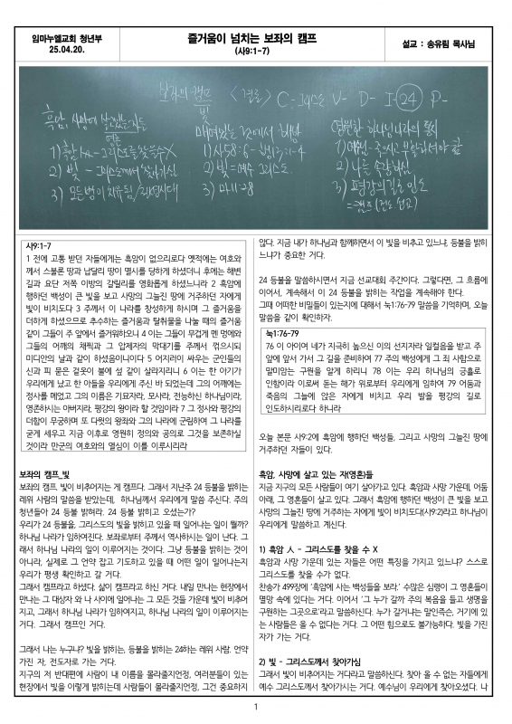 2025.04.20 메시지 - 즐거움이 넘치는 보좌의 캠프(사9:1~7) |